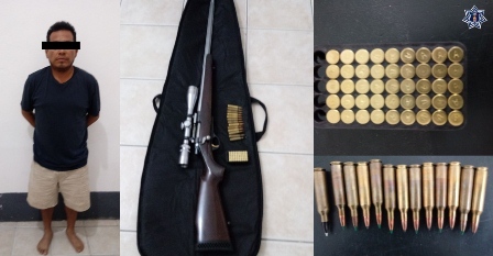 Por otra parte, un sujeto de nombre Carlos MR, de 44 años de edad, fue detenido sobre el libramiento a la altura del arroyo Macalla, en San Pedro Pochutla, municipio de la región de la Costa, ya que llevaba consigo un rifle 22-250 y un estuche con 45 cartuchos calibre 22 y 13 cartuchos calibre 22-250.