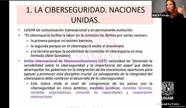 En su oportunidad, la académica de la Facultad de Derecho de la Universidad de Salamanca, María Concepción Gorjón Barranco, planteó que hay quienes afirman que hoy se libra la Tercera Guerra Mundial en el ciberespacio y se basa en ciberataques a infraestructuras críticas como los sistemas informáticos de servicios de salud, energía, aeropuertos, entre otros.