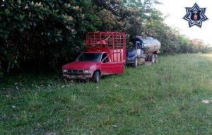 Lo mismo ocurrió con una camioneta marca Nissan, tipo ganadera y color rojo, donde se localizaron dos contenedores con capacidad de mil litros, abastecidos a un 50 por ciento de su capacidad y a unos metros del lugar también fueron ubicados cinco contenedores con la misma capacidad que los anteriores, abastecidos en un 80 por ciento.