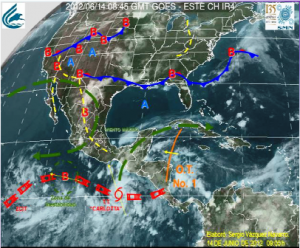 Pronóstico general en las próximas 24 horas: Se prevé que la amplia circulación de la tormenta tropical “Carlotta” localizada frente a las costas de Oaxaca y Chiapas, continúe intensificándose y desplazándose hacia el Noroeste.