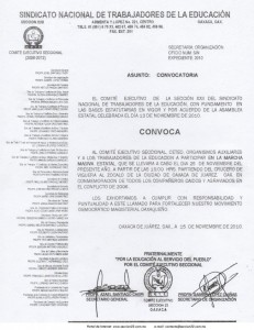 El Comité ejecutivo de la Sección 22 del Sindicato Nacional de los Trabajadores de la Educación está convocando a una manifestación masiva para el primero de diciembre del presente año, que partirá de las 10 de la mañana del Monumento a Juárez, del crucero de Guelatao al Zócalo de la ciudad de Oaxaca, para repudiar al asesino Ulises Ernesto Ruiz Ortiz, hasta el ultimo día de su mandato y para fijar la posición política del Movimiento Democrático de los Trabajadores de la Educación de Oaxaca, señala la convocatoria emitida por el Comité Ejecutivo Seccional.