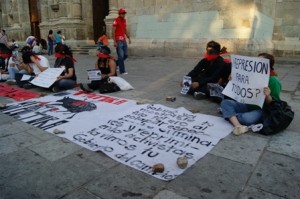 Los jóvenes vendados de los ojos y con la boca tapada exhibieron fotografía de la actuación de la Policía Preventiva de Oaxaca, cuando arremetieron en contra de ellos al formar una valla en la entrada posterior de la plaza, que lució semivacía.