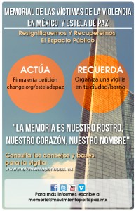Poetas, periodistas, politólogos, actores, dramaturgos, escritores, solicitan al presidente Enrique Peña Nieto la resignificación del monumento conocido como estela de Luz en memoria de las Víctimas de la Violencia en México y Estela de Paz. A continuación el texto de la carta:
