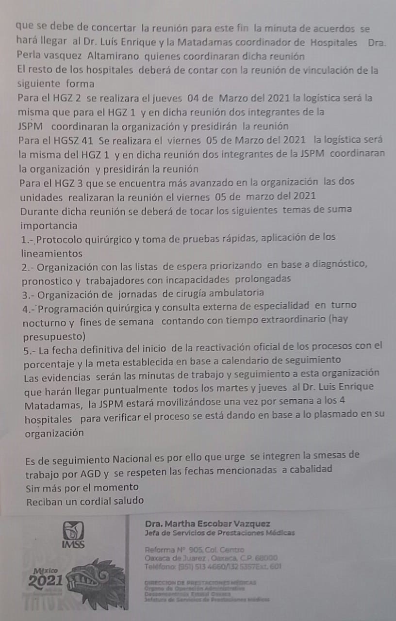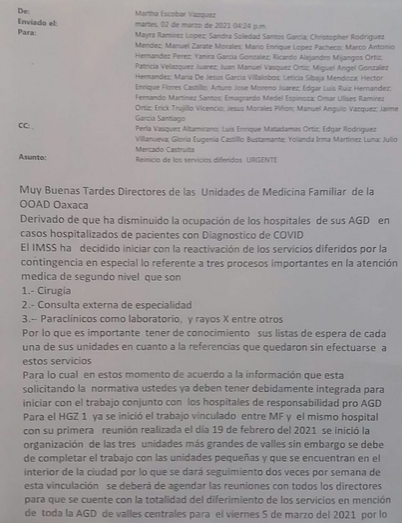 Dentro de la información que requerimos es saber: ¿sí es verdad que existe una velada amenaza a los trabajadores de ser enviados al área COVID-19, si hacen del conocimiento público las anomalías que existen en el IMSS Oaxaca? ¿Si está de acuerdo que los altos mandos del IMSS Oaxaca ocupen sean funcionarios en otra dependencia del Sector Salud de Oaxaca, como sucede con Martha Escobar Vázquez? Estas entre otras más.