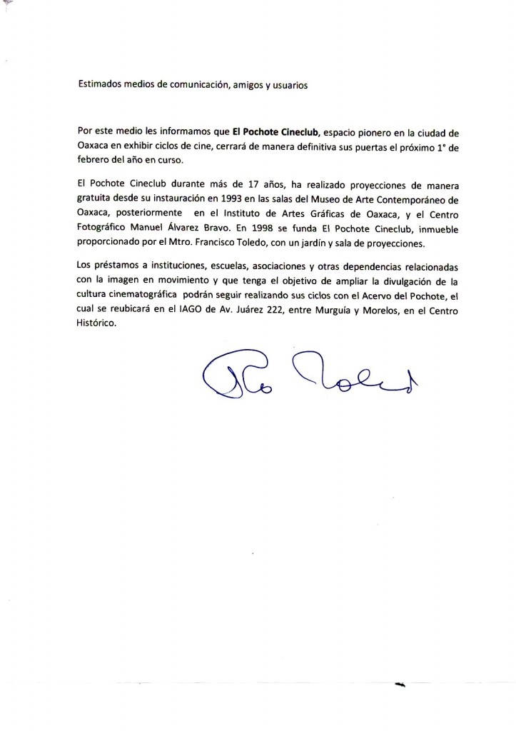 OAXACA.- El Cineclub el Pochote cerrara sus puertas a partir del primero de febrero, luego de 17 años de funcionamiento de manera gratuita y financiado por el creador plástico Francisco Toledo, según lo dio a conocer Efraín Constantino Estrada, encargado del lugar.