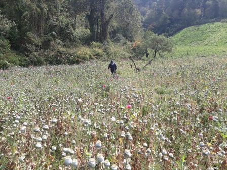 Al detectar el lugar, los efectivos realizaron operativos terrestres, en donde localizaron dos terrenos, uno de ellos con una superficie de 100 mil metros cuadrados, sembrado con plantas de amapola con un peso aproximado de 142 mil 900 kilogramos.