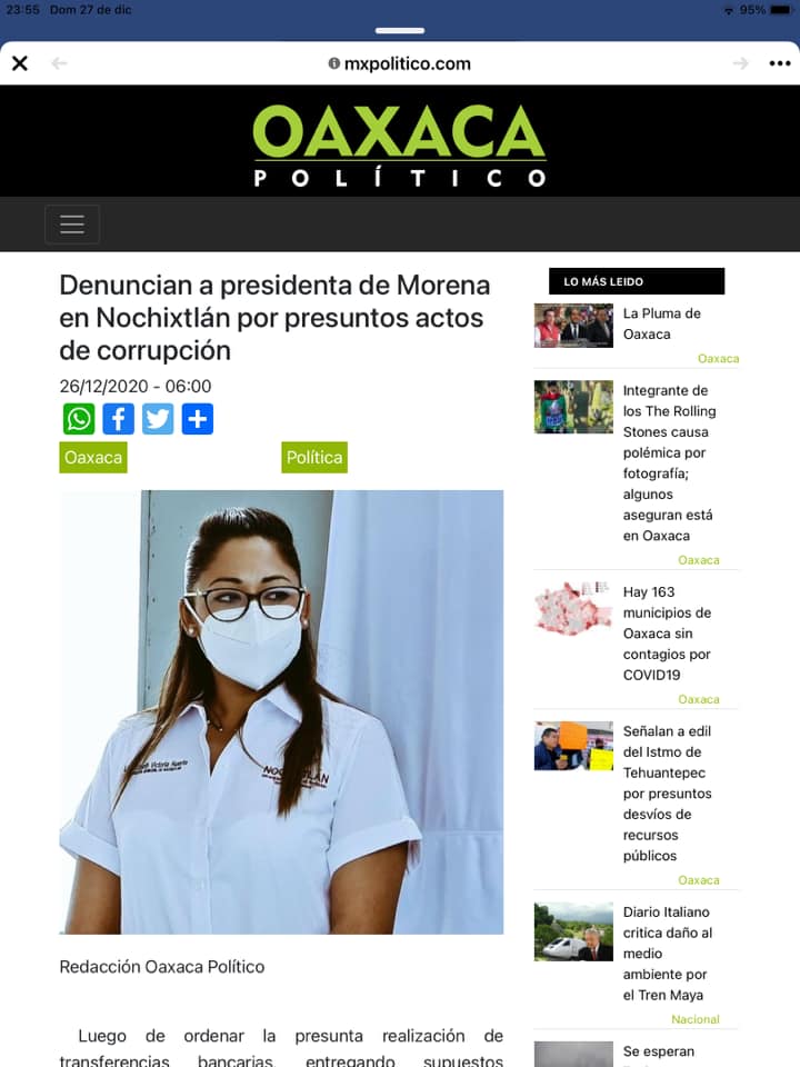 Cabe mencionar que en las más de 10 denuncias qué hay en su contra ha sobornado a servidores públicos , está la de la OSFE donde se han entregado decenas de facturas Falsas justificando millones , también hay un reportaje de televisa Oaxaca acerca de esto , está la del Tribunal electoral por utilizar la pandemia para hacerse publicidad, pretendiendo reelegirse para seguir el desfalco y en el IAIP tiene ahorita 5 días hábiles para entregar estados de cuenta y obra pública , en tres ocasiones a hecho tiempo entregando links inexistentes.