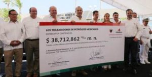 Ciudad de México.- Los trabajadores de Petróleos Mexicanos (PEMEX) entregaron 38 millones 712 mil pesos como parte del donativo que realizaron voluntariamente para contribuir al proceso de reconstrucción de infraestructura en el estado de Oaxaca, afectado por los sismos de septiembre pasado.