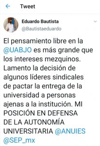En la primera hora de este jueves 9 de octubre del año 2020, Eduardo Bautista Martínez, rector de la Universidad Autónoma Benito Juárez de Oaxaca (UABJO), emitió un mensaje en su cuenta de Twitter en el que se lee: