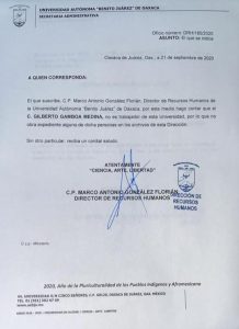 El escrito está firmado por Marco Antonio Gonzáles Florián, Director de Recursos Humanos de la UABJO.