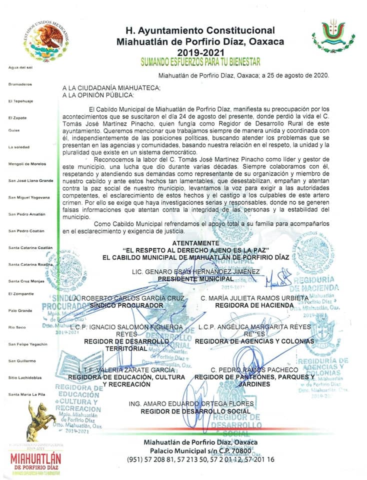 Ante la ejecución de su dirigente el FPR demanda la renuncia de Vicente Mendoza Téllez Girón, Secretario de Finanzas del Gobierno del Estado, del Fiscal General de Justicia de Oaxaca, Rubén Vasconcelos Méndez y del presidente municipal de Miahuatlán, Genaro Hernández, cuyo cabildo emitió un comunicado, la noche de ayer (lunes 24 de agosto), lamentando el crimen y demandó a las autoridades realicen una investigación “seria y responsable”.
