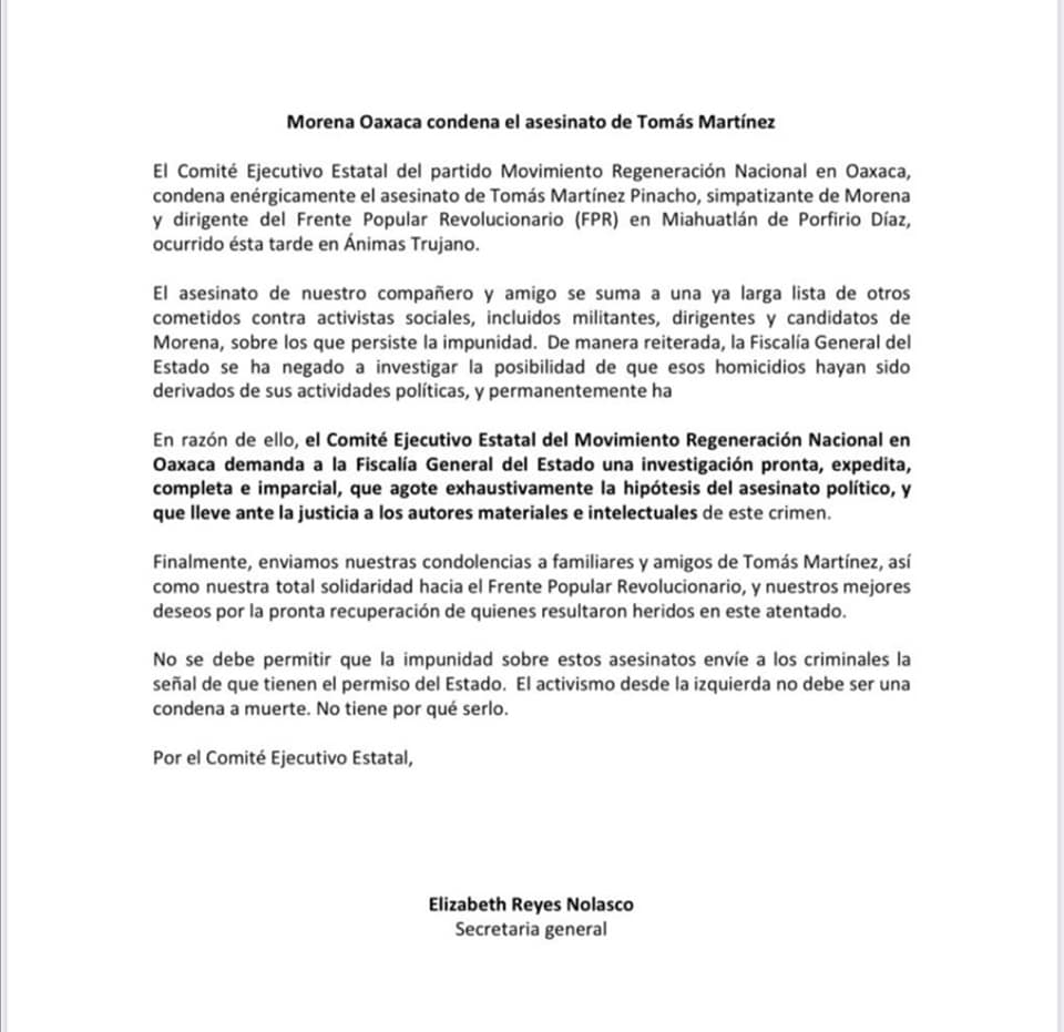 En tanto la dirigencia estatal del Partido Movimiento de Regeneración Nacional (Morena) emitió un boletín de prensa en que la Secretaria General de Morena, Elizabeth Reyes Nolasco, condenó el asesinato del regidor de Desarrollo de Miahuatlán, cuya muerte se “suma a una larga lista de otros cometidos contra activistas, sociales, incluidos militantes, dirigentes y candidatos de Morena obre los que persiste la impunidad”.