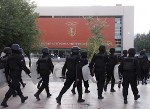 Unos 100 elementos de la policía Auxiliar, Bancaria, Industrial y Comercial (PABIC) y de la Policía Estatal Preventiva vigilan los acontecimientos en tanto l Avenida Universidad se encuentra bloqueada con dos autobuses del transporte urbano.