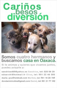 Oaxaca.- La semana pasada recogimos cuatro cachorritos abandonados a su suerte en medio de la carretera, en Etla, según reporta la asociación Activistas de Protección Animal de Oaxaca (APAO) quien los pone en adopción aquí el mensaje completo.