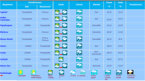 Medio nublado a nublado, probabilidad de lluvia mayor del 80%, temperaturas templadas a cálidas y viento de componente Este de 20 a 35 km/h con rachas. Tormenta eléctrica y viento fuerte