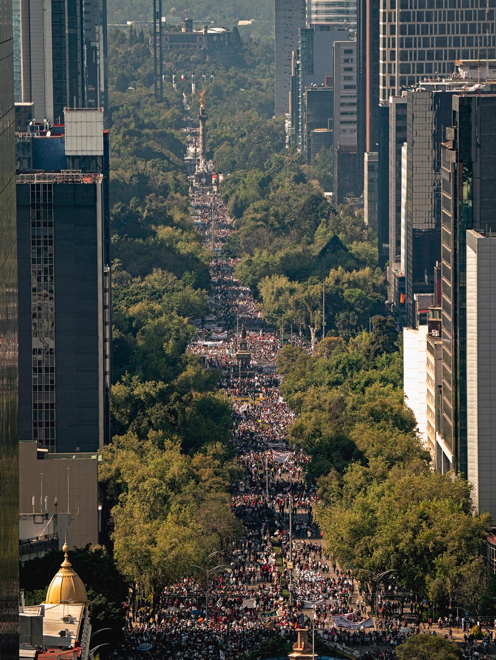 Tras encabezar la marcha, que inició a las 9:00 horas en el Ángel de la Independencia, afirmó que la nueva política económica, moral y social consiste en fomentar el progreso con justicia, es decir, la distribución equitativa del ingreso y la riqueza.