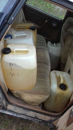 Al inspeccionar el lugar, también se localizaron cuatro contenedores de plástico con estructuras metálicas, con capacidad de mil litros cada uno, seis bidones de plástico con capacidad de 50 litros cada uno, seis bidones de plástico con capacidad de 20 litros cada uno y un tambo de plástico de color negro con capacidad de 200 litros, por la cantidad de bidones y contenedores hacen un total aproximado de tres mil 900 litros.