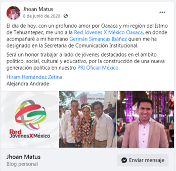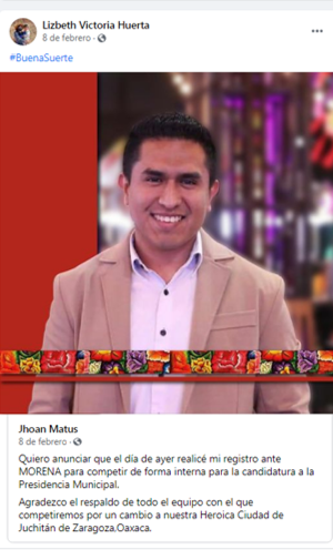 Para el mes de febrero Johan Ricardo Matus, en menos de cuatro meses de haber haber dejado al PRI, aspira a ser candidato a la presidencia municipal de Juchitán por el Partido Morena, que fue el primer municipio que ganó la izquierda de México en 1981, lo que refleja sus deseos de tener poder a través de una vertiginosa carrera política, el mensaje de anhelo lo posteó en la página de Lizbeth Vitoria Huerta, que le deseó éxito.