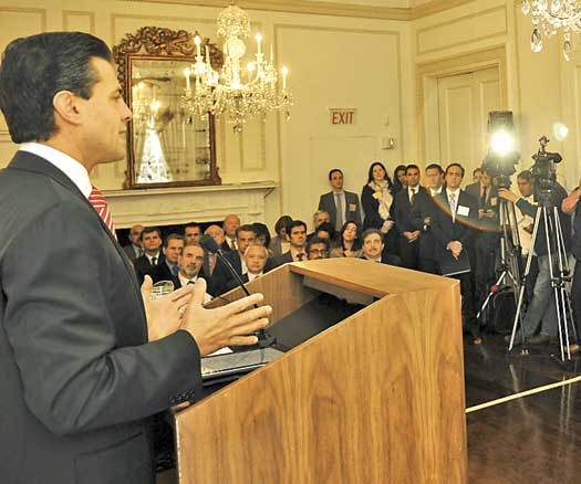 Negroponte, ahora presidente de la Sociedad de las Américas y el Consejo de las Américas, presentó a Peña Nieto como “el hombre que ha sido capaz de convertir al Estado de México una entidad en el principal destino de la inversión directa de México y en una de las más importantes fuentes de creación de empleo en los últimos años”, según un reporte del corresponsal Jaime Hernández, de El Universal.