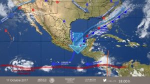Pronóstico de precipitación máxima (acumulada en 24 h) para este 18 de octubre de 2017: Tormentas muy fuertes con puntuales intensas (75 a 150 mm) en Veracruz y Tabasco; Tormentas fuertes con puntuales muy fuertes (50 a 75 mm) en Oaxaca, Chiapas, Campeche y Yucatán.