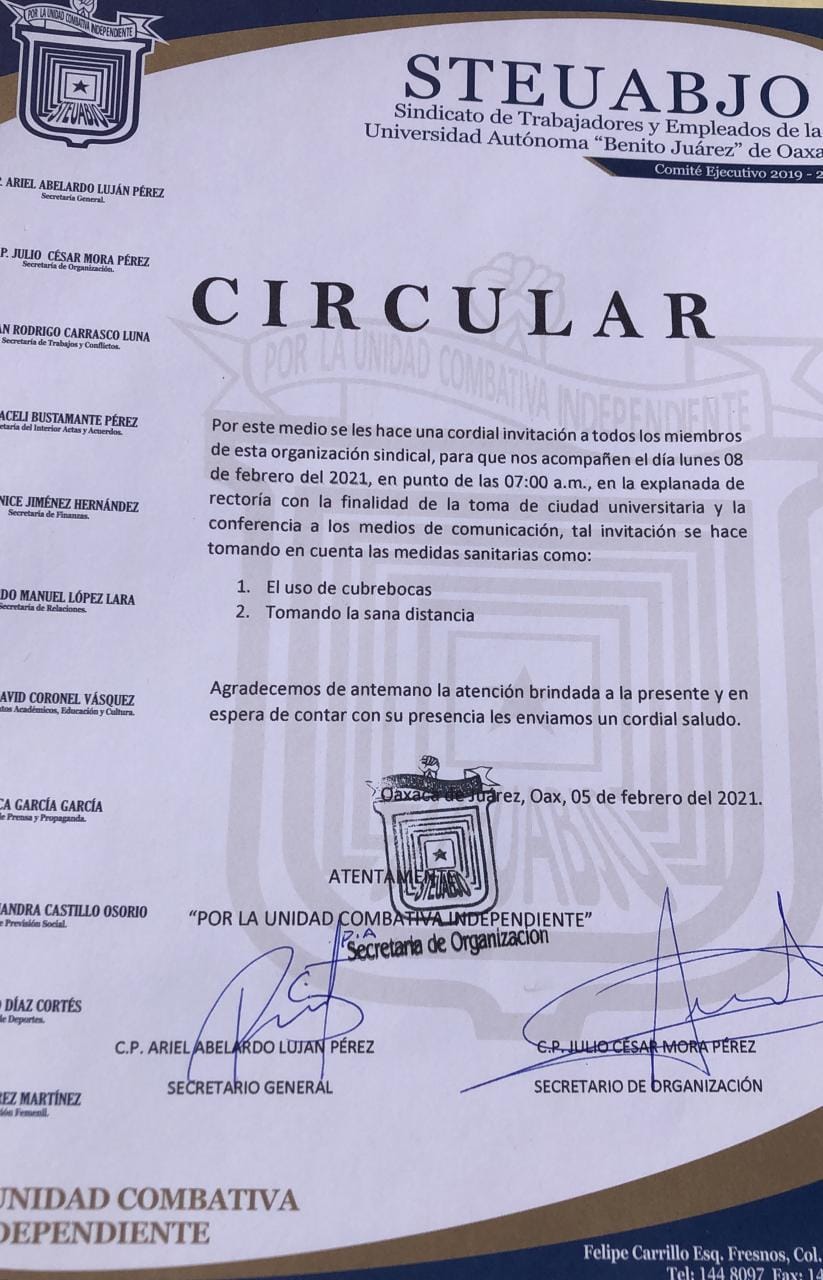 Los afiliados del STEUABJO han sido convocados a las siete de la mañana de este lunes, 8-II-2021, en la explana de rectoría de Ciudad Universitaria, al tiempo que convocaron a una rueda de medios a la misma hora.