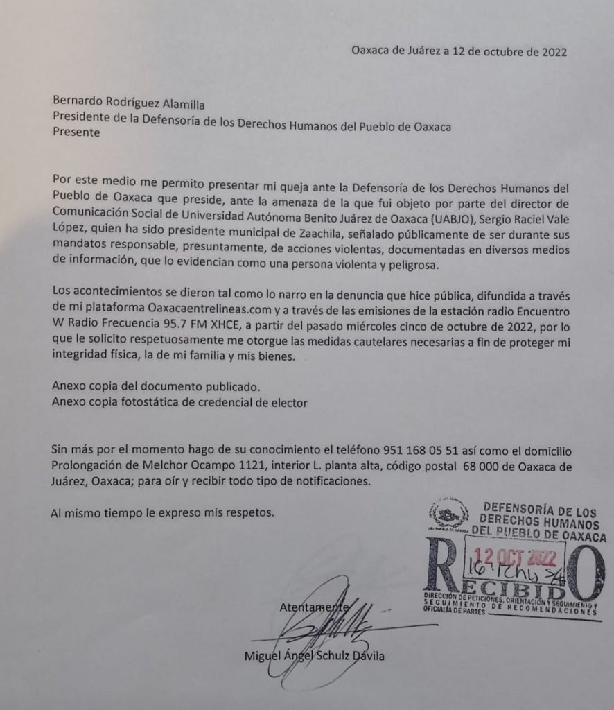 Este miércoles 12 de octubre de 2022, presenté ante el presidente de la Defensoría de los Derechos Humanos del Pueblo de Oaxaca (DDHPO), Bernardo Rodríguez Alamilla, mi queja y solicitud de medidas cautelares ante la amenaza vertida por Raciel Vale López, director de Comunicación Social de la Universidad Autónoma “Benito Juárez” de Oaxaca, ex presidente municipal de Zaachila en el trienio 2014-2016 y ex candidato al mismo cargo en el proceso electoral 2018, cuya trayectoria se ha distinguido por cometer actos de violencia y abusos de autoridad.