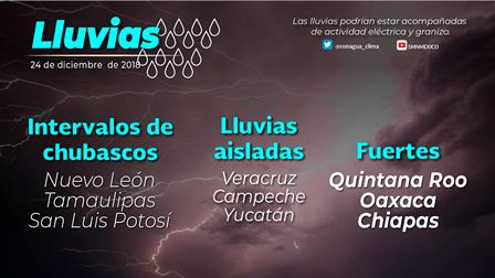 Se pronostican tormentas fuertes en zonas de Baja California; lluvias con intervalos de chubascos en sitios de Sonora, Chihuahua, Oaxaca, Chiapas, Campeche, Yucatán y Quintana Roo; lluvias aisladas en Nuevo León, Tamaulipas, Zacatecas, San Luis Potosí, Puebla, Jalisco, Veracruz y Tabasco, y viento del norte con rachas de 50 km/h en el Istmo y Golfo de Tehuantepec.