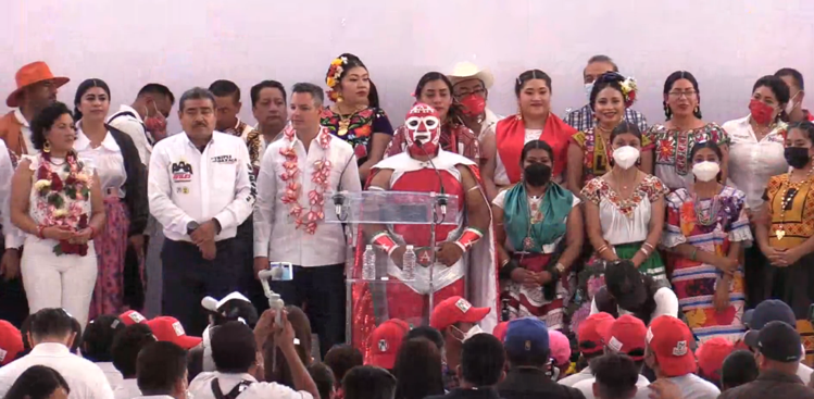 En el presídium tomados de la mano con un luchar enmascarado el candidato del PRI y del PRD, a la gubernatura, el mandatario Alejandro Murat, así como un nutrido grupo de mujeres ataviadas con vestidos de las etnias de Oaxaca.