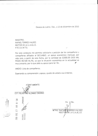 Oaxaca.- Rafael Torres Valdés rector de la UABJO tiene injerencia total en los cinco sindicatos de la Máxima Casa de Estudios de Oaxaca, ya que de manera discrecional asigna recursos económicos, solicitados por personas sin ninguna representación sindical, como él es caso de Felicitas Alonso Osorio quien recibe, a nombre de 28 de sus compañeros, 56 mil pesos mensuales desde el mes de diciembre como ayuda por vida cara y ahora se presenta como candidata a secretaría general del Sindicato de Empleados de Confianza de la institución (SECUABJO).