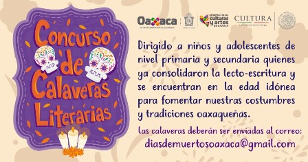 Para conmemorar estas fechas tan importantes y de gran tradición para las y los oaxaqueños, la Secretaría de las Culturas y Artes de Oaxaca (SECULTA) busca fomentar las costumbres y tradiciones de la entidad, por ello convoca a niños y jóvenes de nivel primaria y secundaria a participar en el Concurso de “Calaveras Literarias” que consta de dos categorías: infantil, de 8 a 12 años y juvenil, de 13 a 15 años.