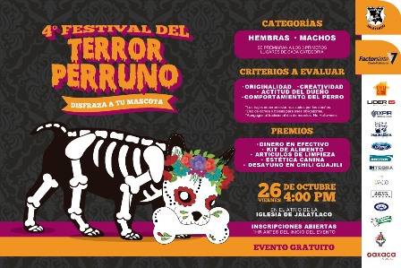 Además, el “Festival del terror perruno” se llevará a cabo en Jalatlaco, que ya es una tradición y parte de las actividades del Barrio, y que consiste en que las y los ciudadanos vistan a sus animales de compañía con atuendos alusivos al tradicional Día de Muertos en México, lo cual sin duda alguna genera ciudadanos más sensibles y participativos en el desarrollo de nuestra cultura y valores.