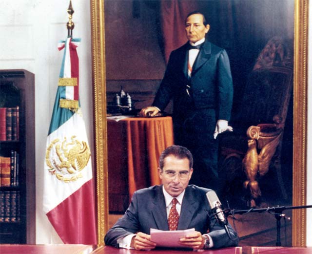 El óleo de Juárez, pintado por Enrique Delanuey en 1889 está basado en un original de Tiburcio Sánchez de la Barquera realizado en 1858. El óleo fue usado por última vez en Los Pinos por el presidente Zedillo. En la pintura, que se encontraba en una de las oficinas de Los Pinos, la imagen del presidente Benito Juárez está de pie portando la banda presidencial, apoya su mano derecha sobre la Constitución de 1857 y a su espalda se observa la silla presidencial.