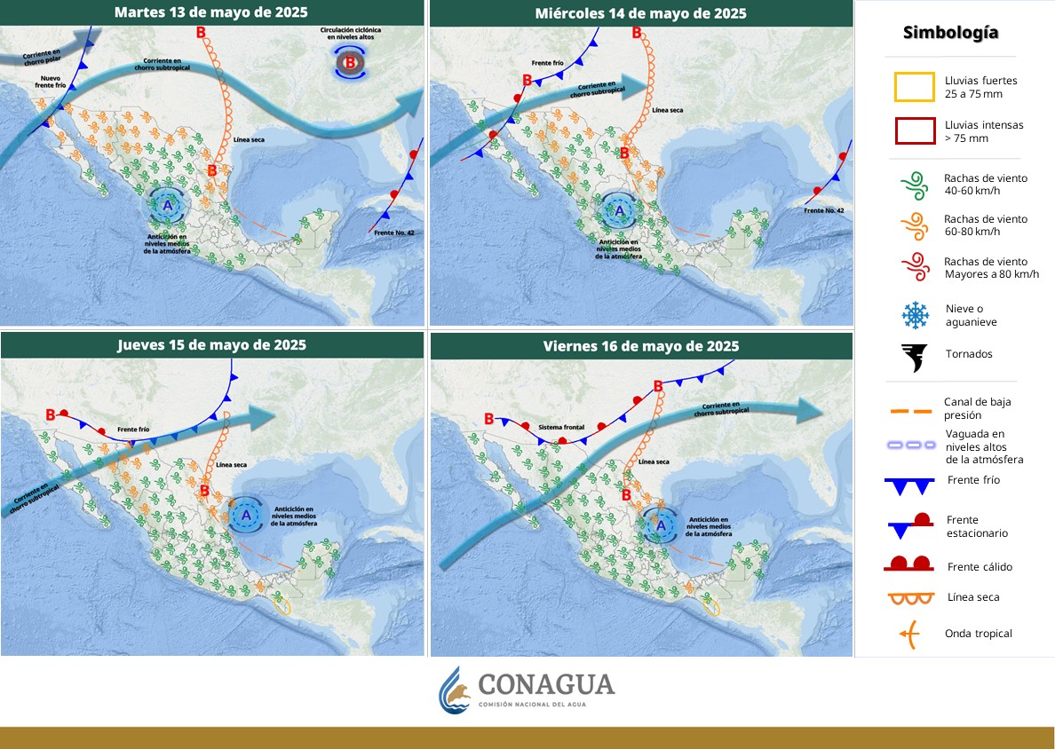 Lo anterior se originará debido a canales de baja presión sobre la Mesa del Norte, la Mesa Central y el sureste de México, el ingreso de humedad del Océano Pacífico, Golfo de México y Mar Caribe, un nuevo Frente Frío al noroeste de México y la corriente en chorro subtropical.