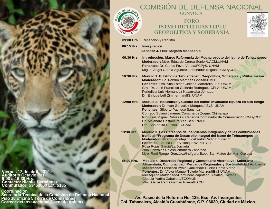 DICHO FORO FUE ORGANIZADO, COORDINADO Y CONVOCADO DE FORMA CONJUNTA, POR LA COMISIÓN DE DEFENSA NACIONAL DEL SENADO DE LA REPÚBLICA, QUE ENCABEZA EL SENADOR J. FÉLIX SALGADO MACEDONIO, CON NUESTRO COMITÉ NACIONAL PARA LA DEFENSA Y CONSERVACIÓN DE LOS CHIMALAPAS.