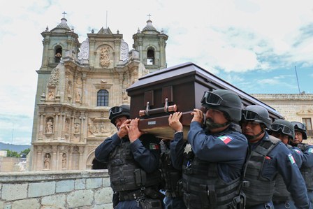 Acompañado por las notas del Dios Nunca Muere, el cuerpo de Don Rubén Vasconcelos abandonó la sede del Ayuntamiento de Oaxaca para seguir su camino hacía el Teatro Macedonio Alcalá, donde continuaría el homenaje a su vida y legado.
