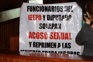 Más de ciento veinte kilos de impunidad en el H. Congreso Oaxaqueño, sí, así como usted lo está leyendo, más de ciento veinte kilos de impunidad protegen en la LXI Legislatura local a un acosador sexual; con la moral por delante y con la frente levantada la joven profesionista Miriam Elena Velasco Velasco llegó hasta las puertas del H. Congreso del Estado en San Raymundo Jalpan y con pancartas en la mano, con voz fuerte y con el coraje reflejado en su rostro, enfrentó al Diputado local del ex desaparecido Partido Convergencia, Perfecto Mecinas Quero a quien acusó con índice de fuego de proteger a un depravo sexual, a un sujeto llamado Timoteo Agustín Chávez Aquino, que se desempeña como Director de Proyectos Educativos del Instituto Estatal de Educación Pública de Oaxaca.