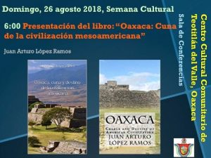 Oaxaca de Juárez, Oaxaca.- Invitado por El Centro Cultural Comunitario de Teotitlán del Valle, el escritor oaxaqueño, Juan Arturo López Ramos, presentará el próximo domingo 26 de agosto a las 18:00 horas en ese lugar, su libro recientemente traducido al idioma inglés, titulado “Oaxaca, cuna y destino de la civilización Americana” en el que destaca la importancia de la cultura zapoteca como la primera en Mesoamérica.